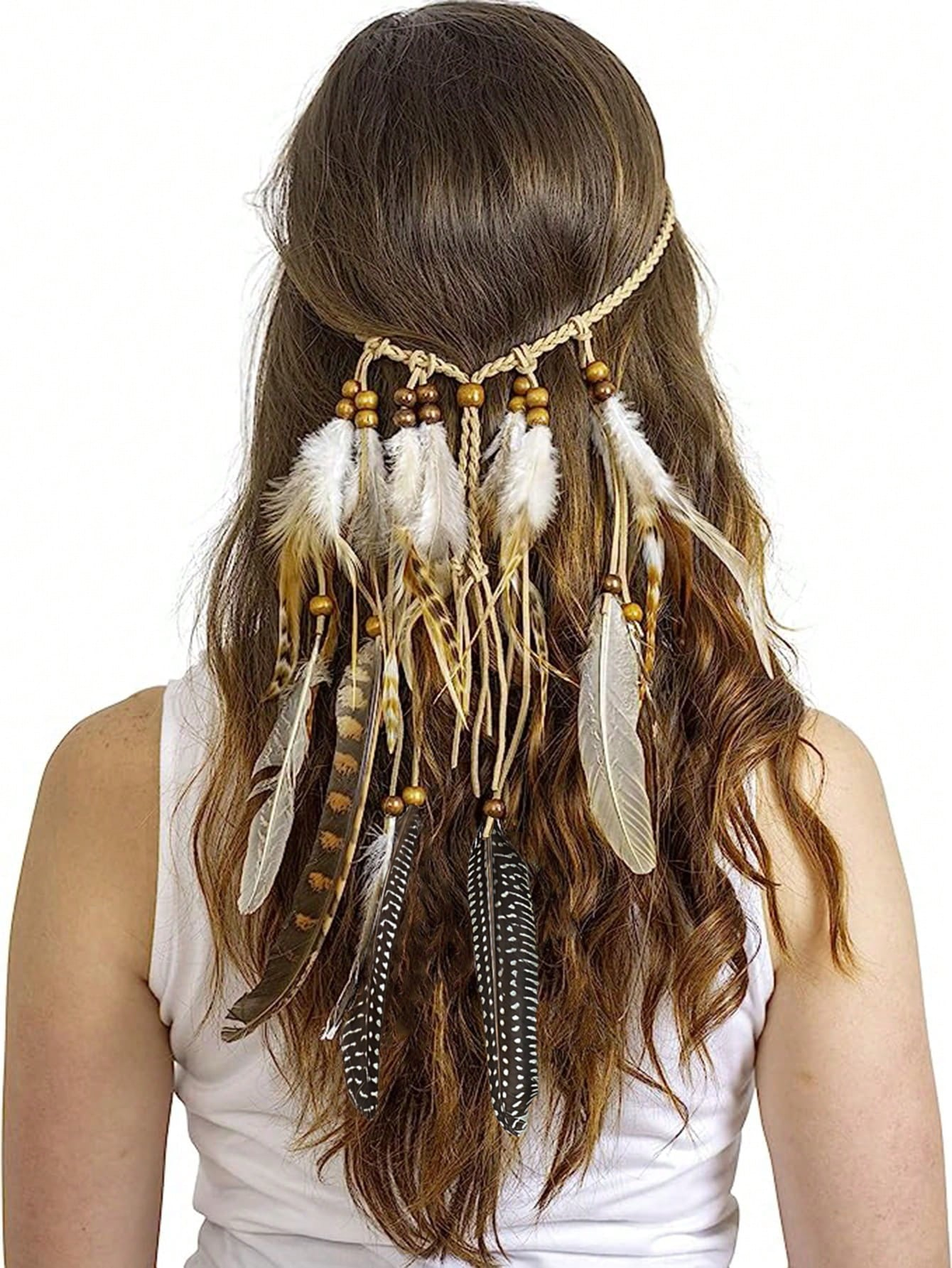 1 PC Beige Color Boho Feather Headband Bohemian Headband Feather Headpiece Feather Hair Jewelry Festival Headpiece Bohemian Feather Extension Boho Headpiece For Women Tiaras Turban Headband Sweatband, School Stuff, College, Headbands