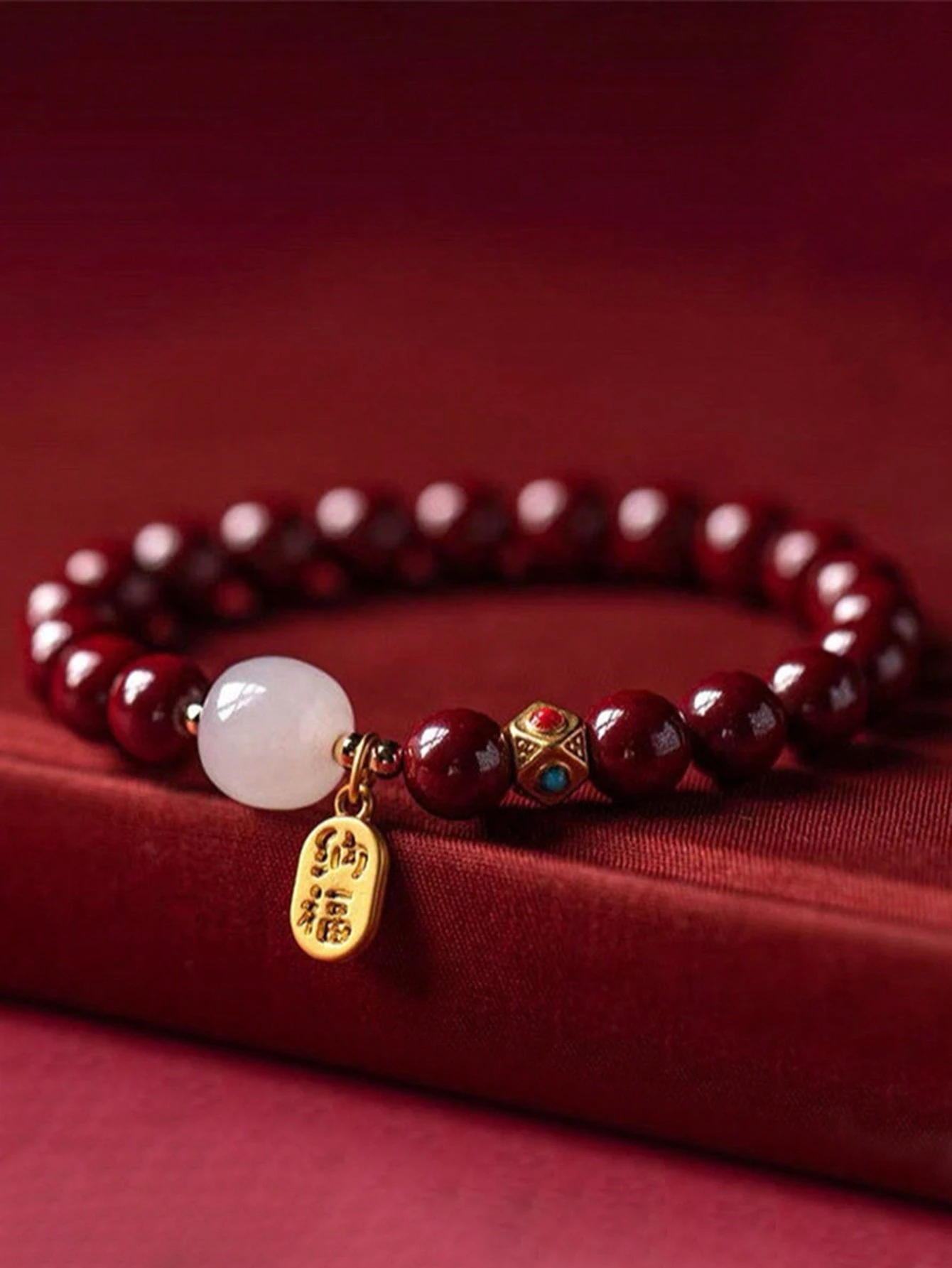 YAUKIA 1pc Red Chinese Style 'Na Fu' Pendant Beaded Bracelet, Lucky Couple And Festival Gift